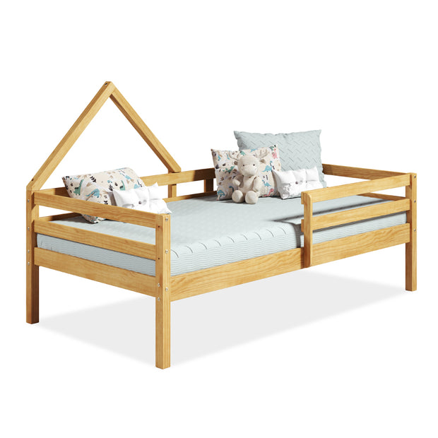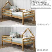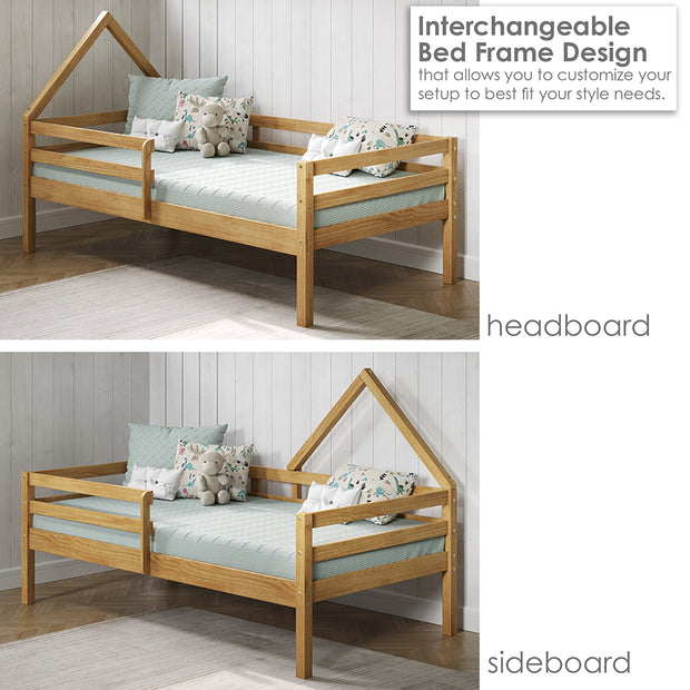 Let your little one’s room be the center of attention with this playful and funky house bed. The slight elevation of the bed also provides extra storage space underneath for whatever may need to be stowed away. The delightful architectural styling and sturdy construction are supremely safe and crafted with durability in mind. The interchangeable bed frame design allows you to customize your setup to best fit your style needs; use the "roof" structure as a headboard, sideboard or footboard.